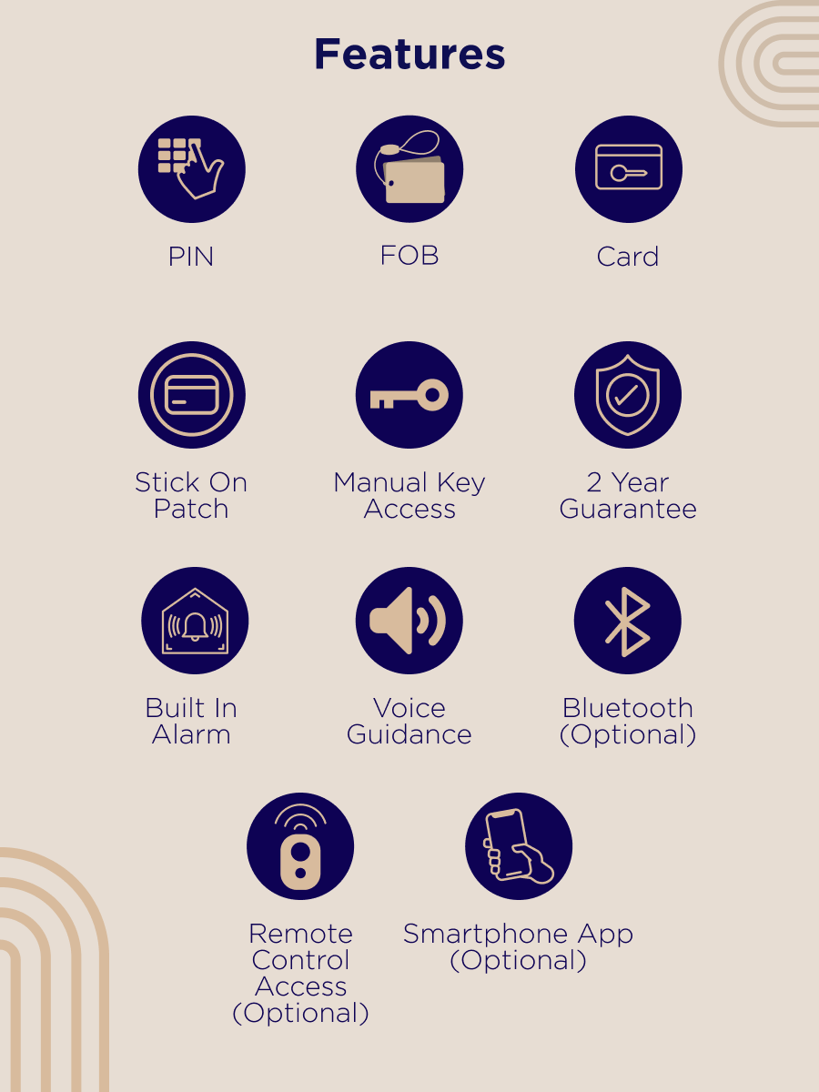 - Access your home by user PIN Code, Card Key, Manual Key & Remote Control (optional) or Phone Key (optional) & Mobile App (optional)