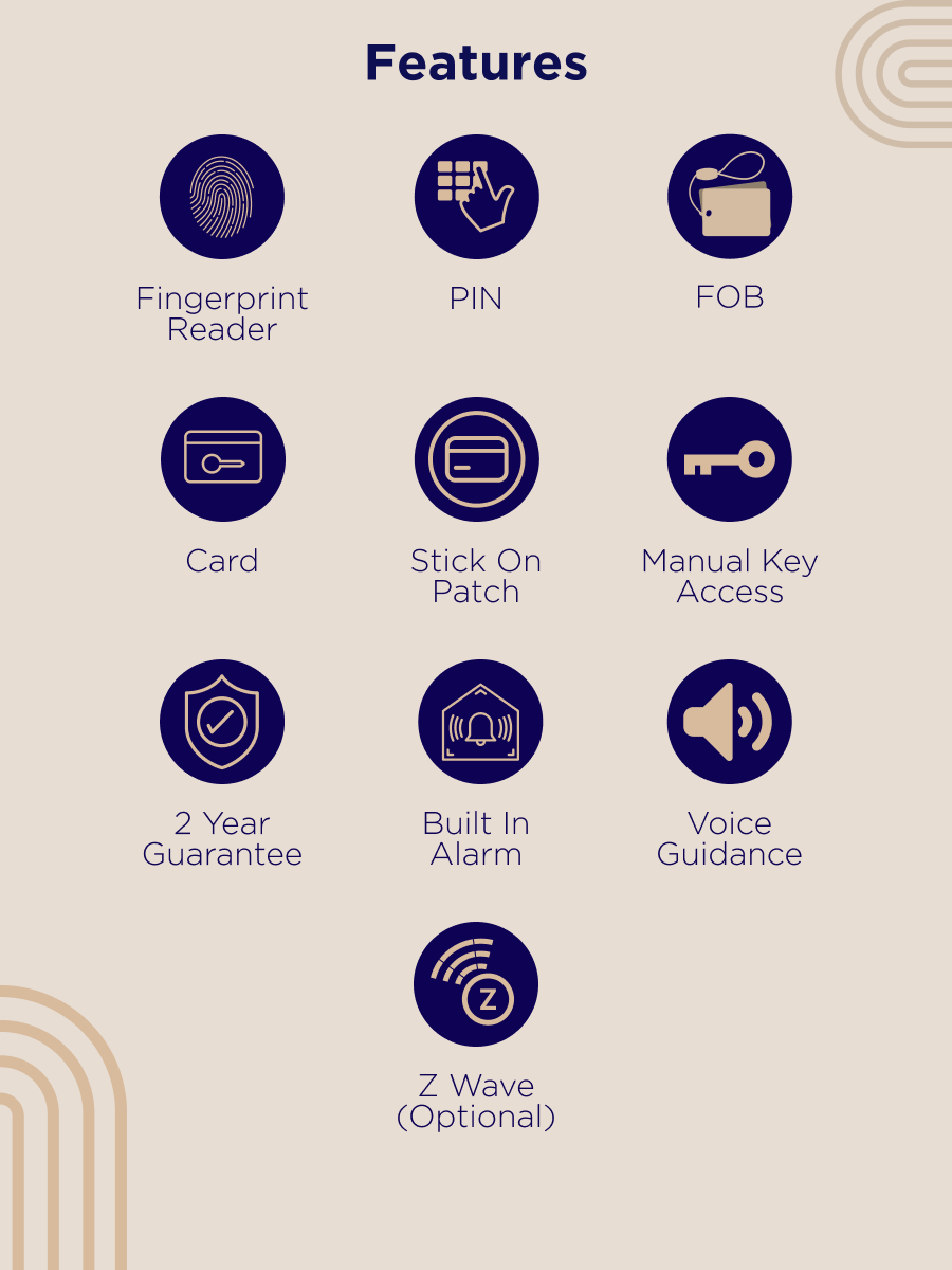 - Access your home by PIN, Card, emergency mechanical Key, FOB or 3rd-party smartphone app.